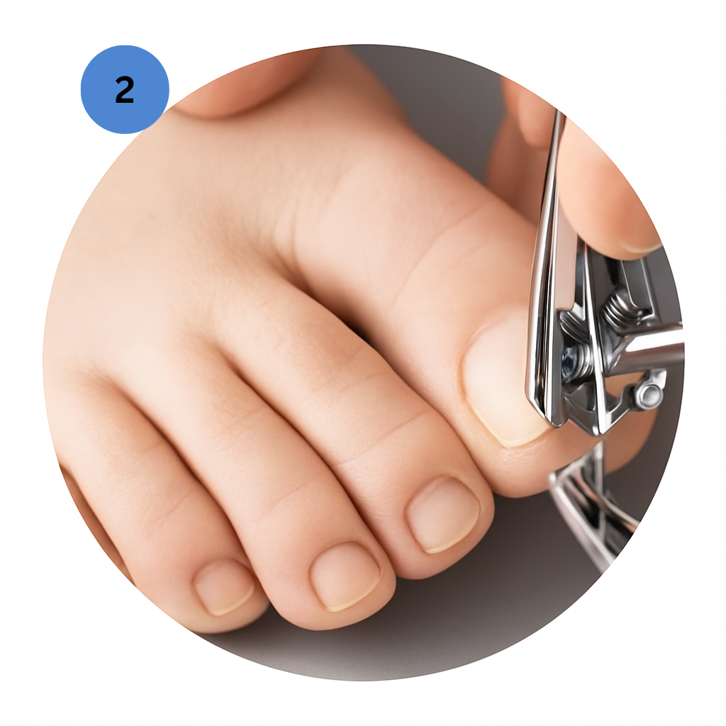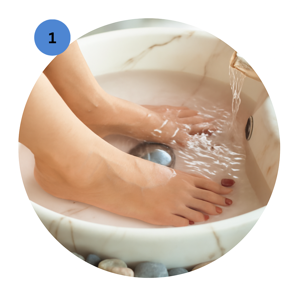 Lavez vos pieds à l’eau tiède pendant 5 minutes pour éliminer les impuretés et préparer les ongles.